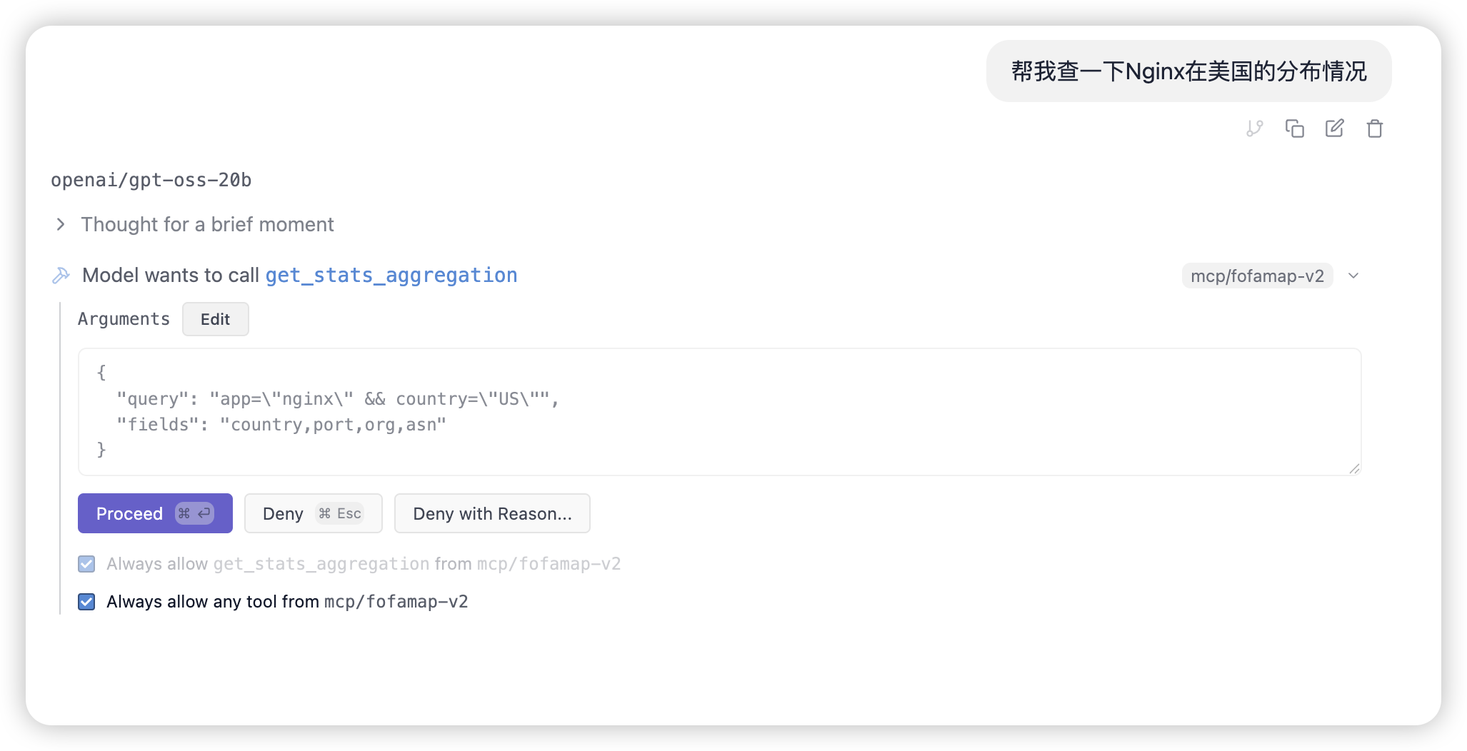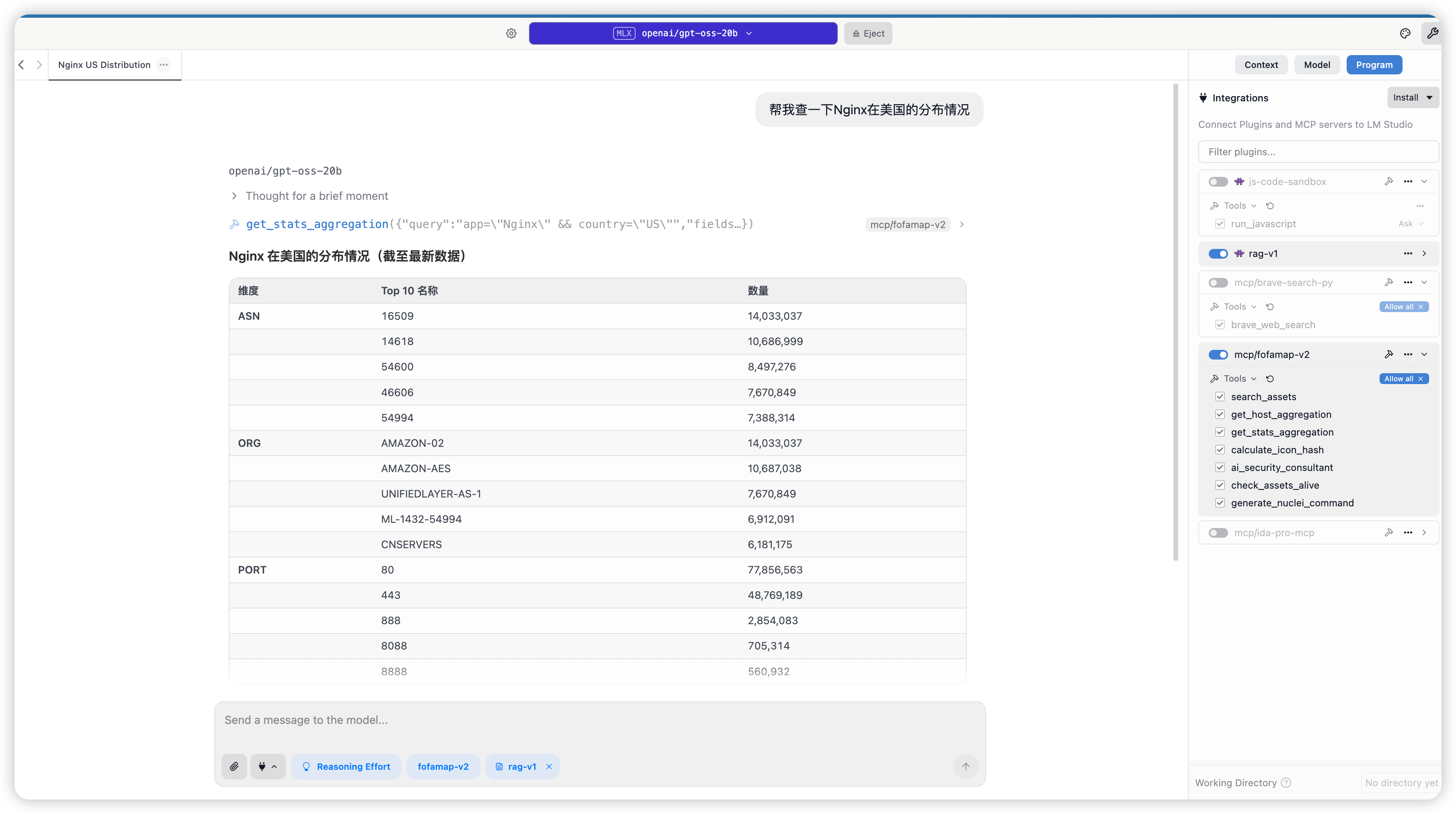 - 输入提示词:“帮我查一下Nginx在美国的分布情况···”
