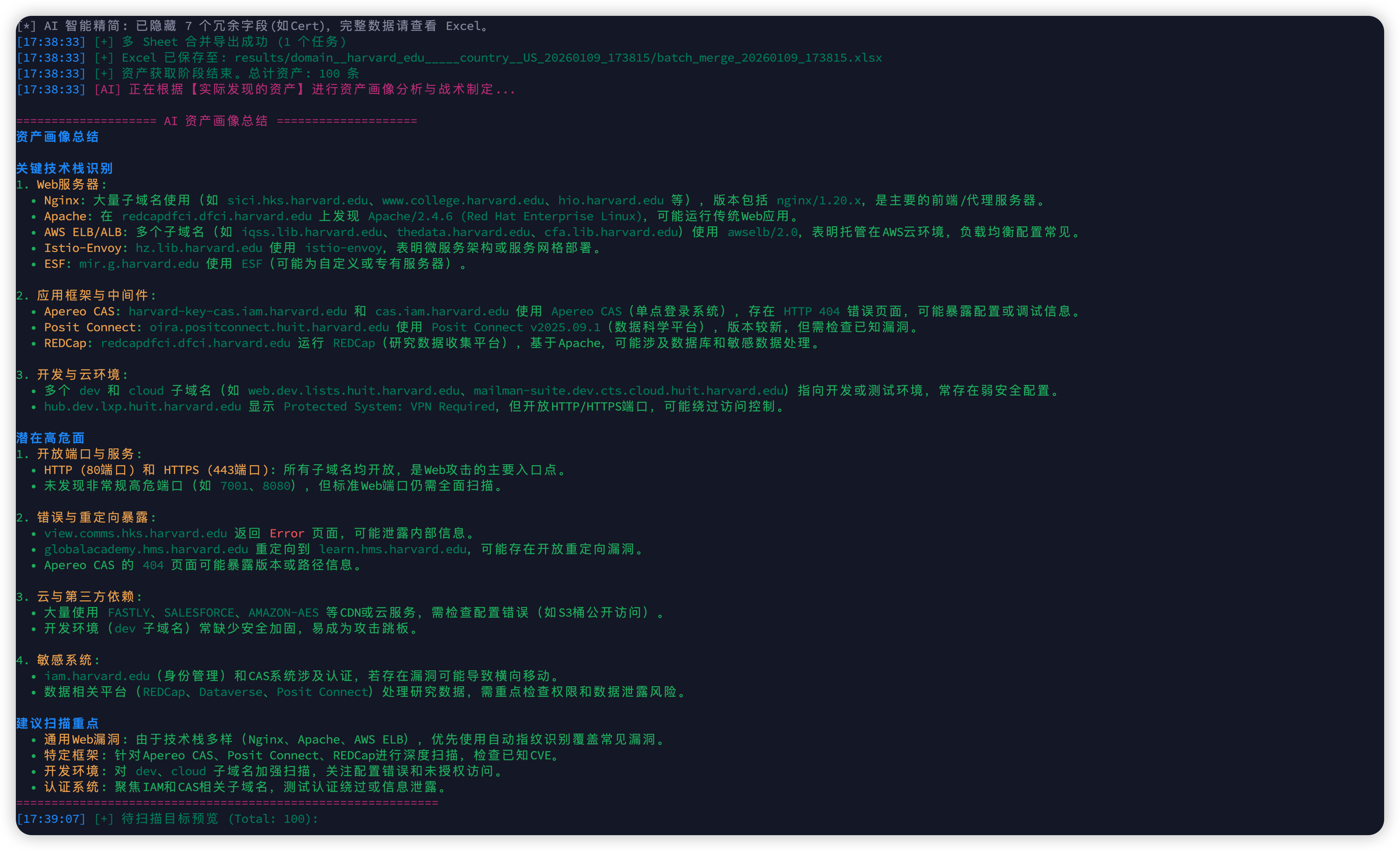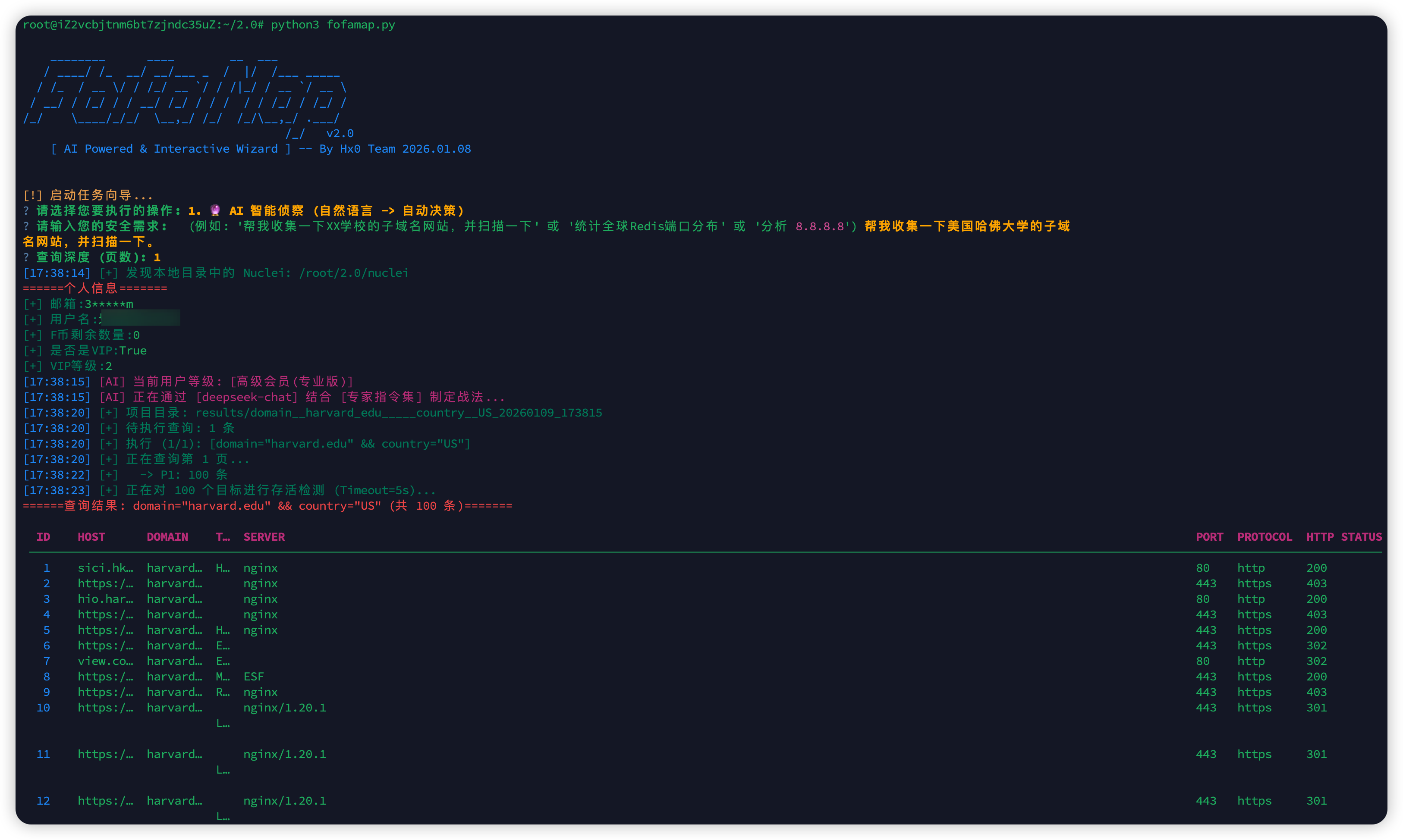 python3 fofamap.py -ai "帮我收集一下美国哈佛大学的子域名网站,并扫描一下"