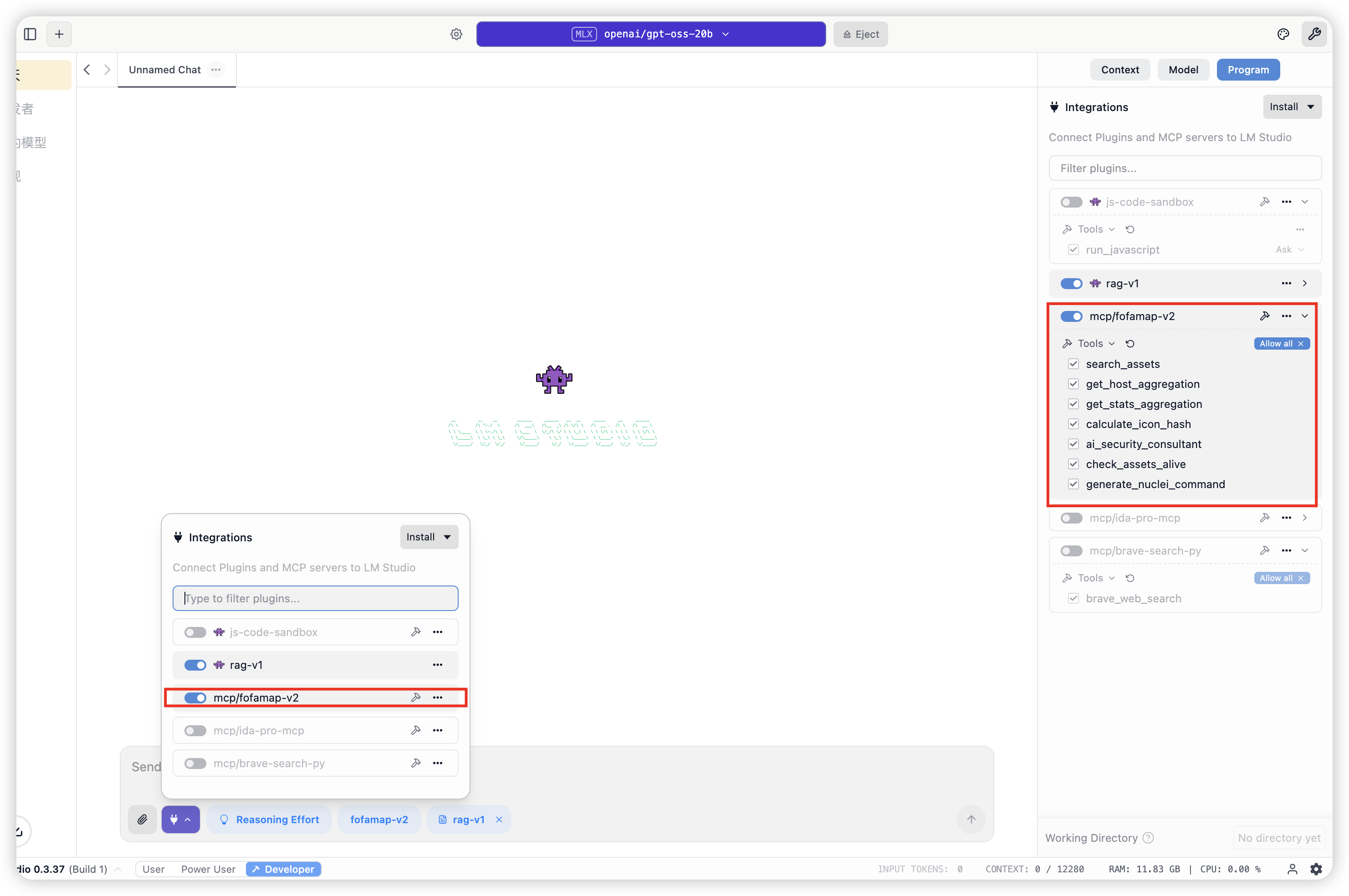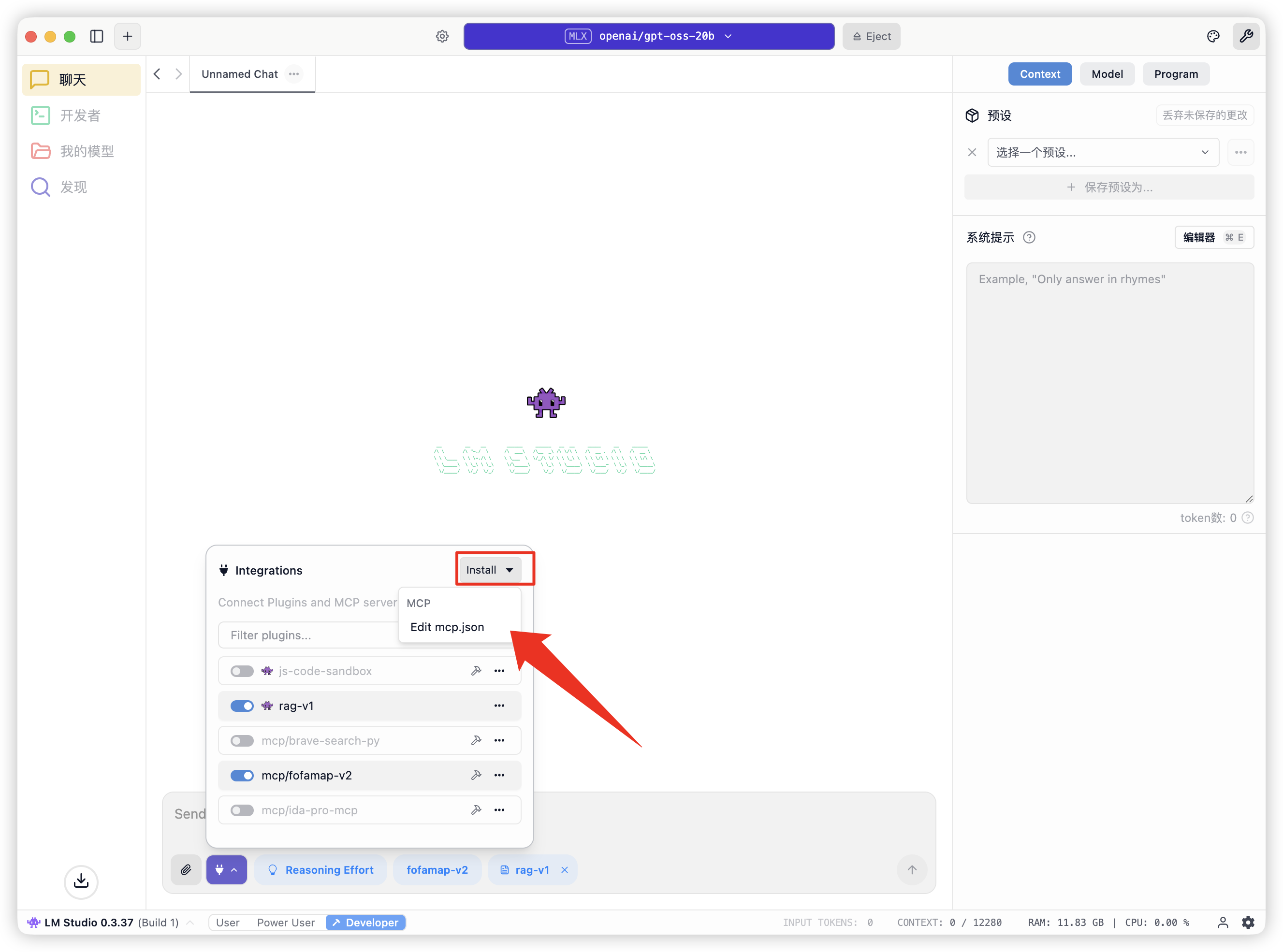 openai/gpt-oss-20b或Qwen 2.5 7B Instruct,或者是 LM Studio 里的 DeepSeek R1/V3)。 - 在聊天框上方的 Tools 下拉菜单中,勾选