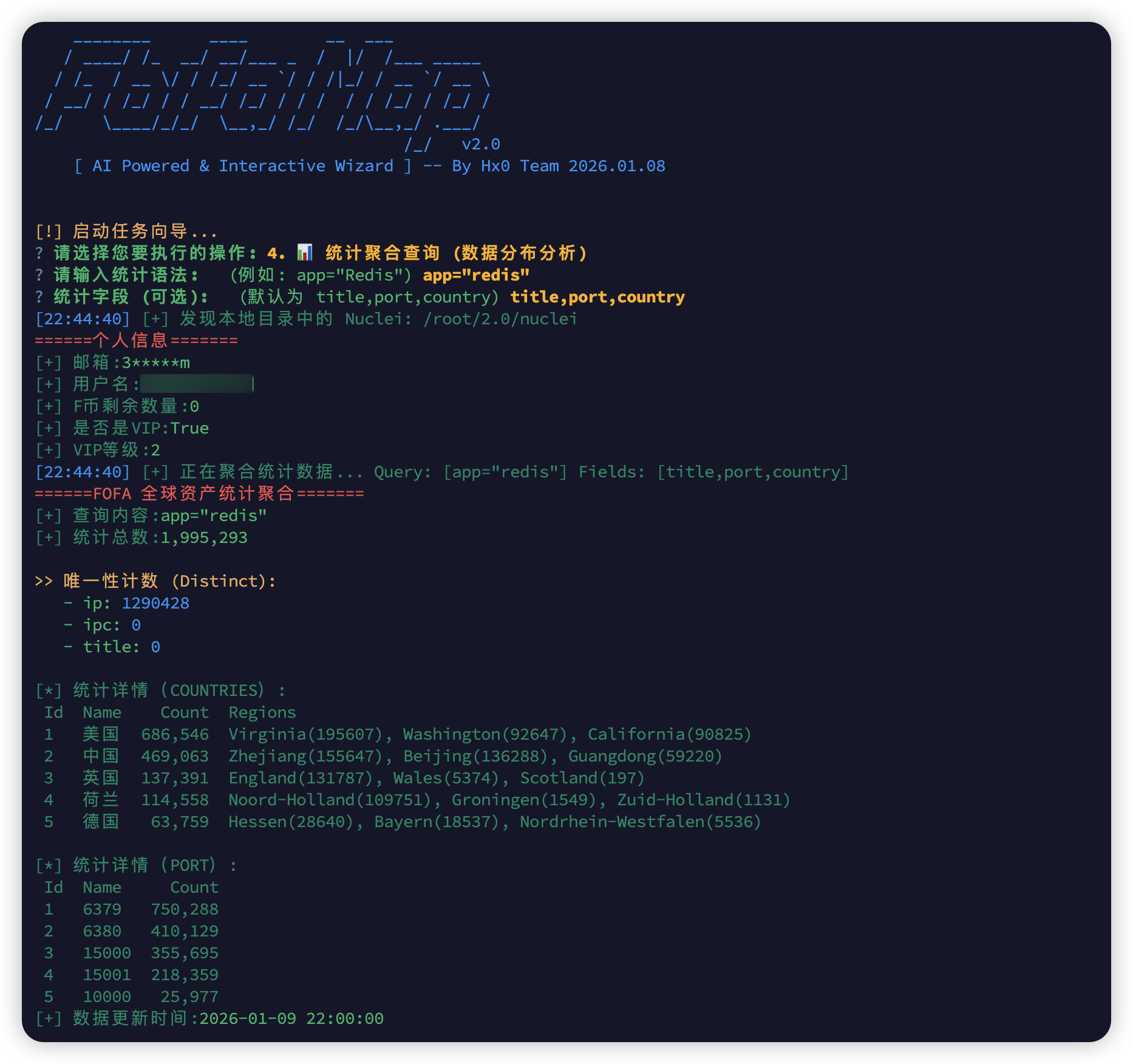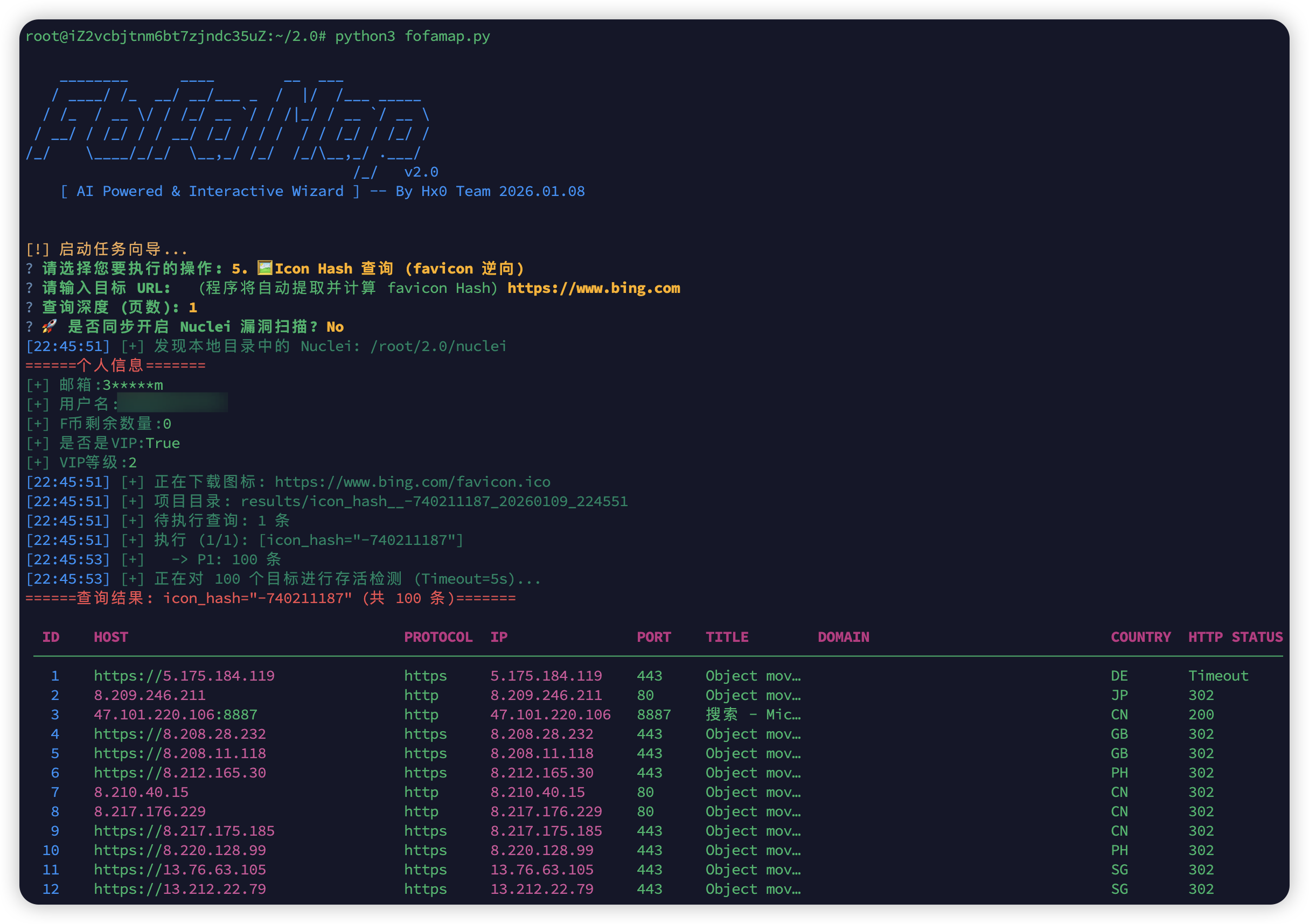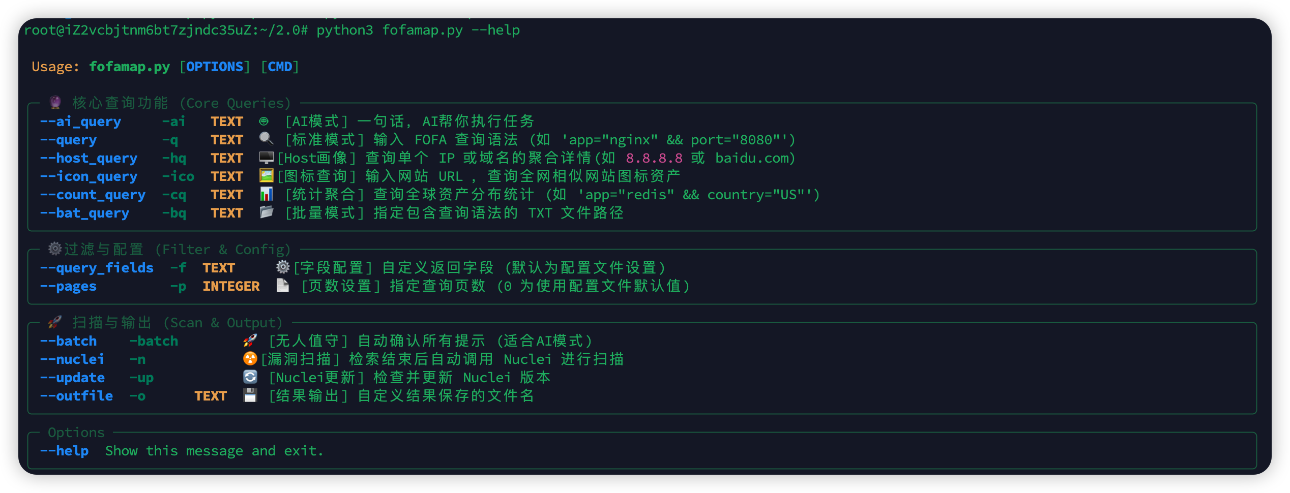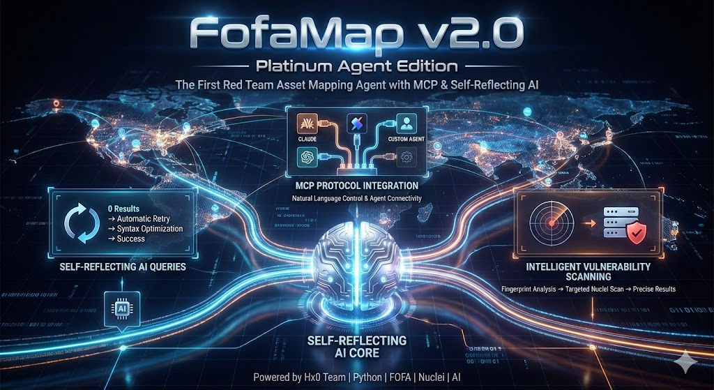 AboutFofaMap v2.0 是一款基于 Python3 开发的全网首个 AI 驱动红队资产测绘智能体。在延续原有 FOFA 数据采集、存活检测、统计聚合、图标 Hash 及批量查询等核心功能的基础上,2.0 版本原生支持 MCP 协议,可无缝接入 Cursor、Claude 等 AI 平台。其核心内置了 AI 自我反思机制,能根据查询结果自动调优语法,并智能联动 Nuclei 推荐精准扫描