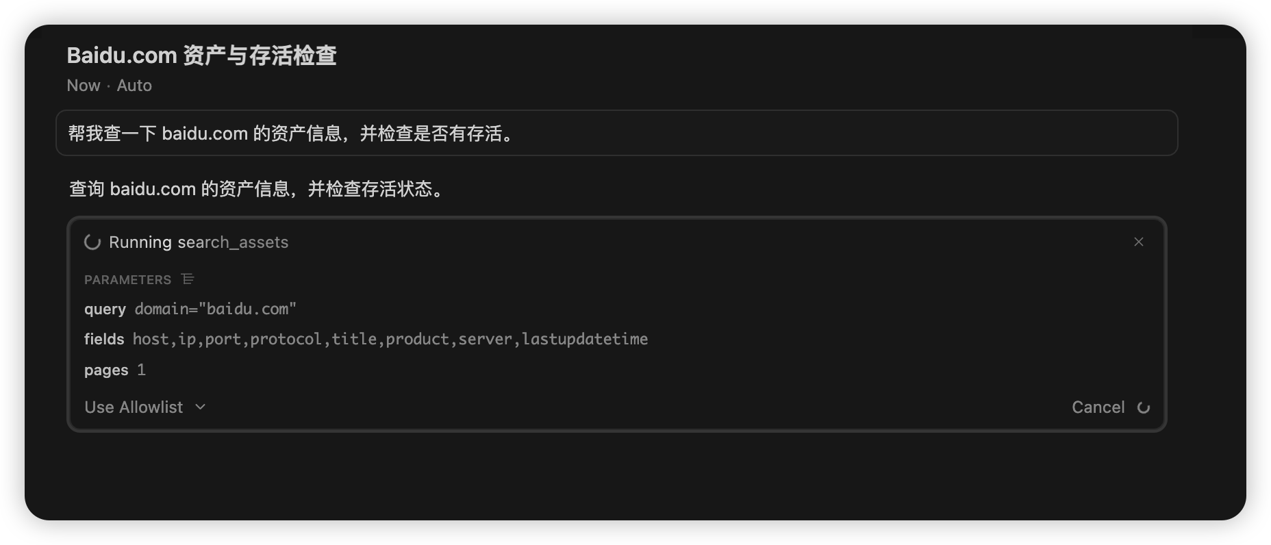“帮我查一下 baidu.com 的资产信息,并检查是否有存活。”
