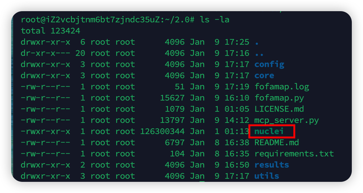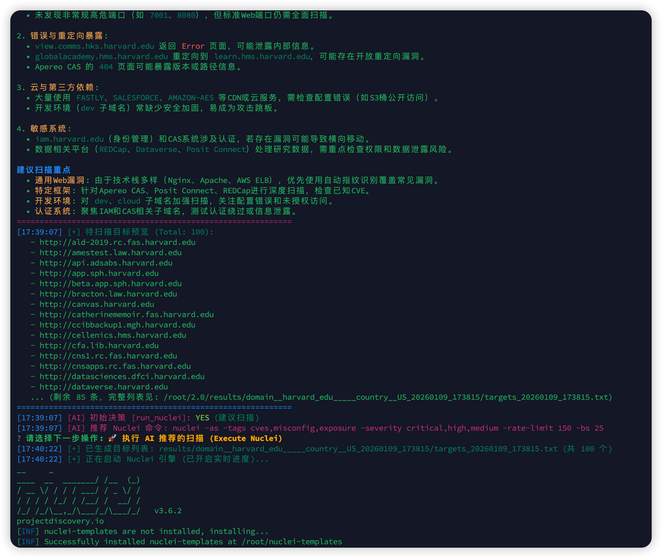 在2.0版本中AI 会根据查询结果智能生成Nuclei漏洞扫描命令参数:
