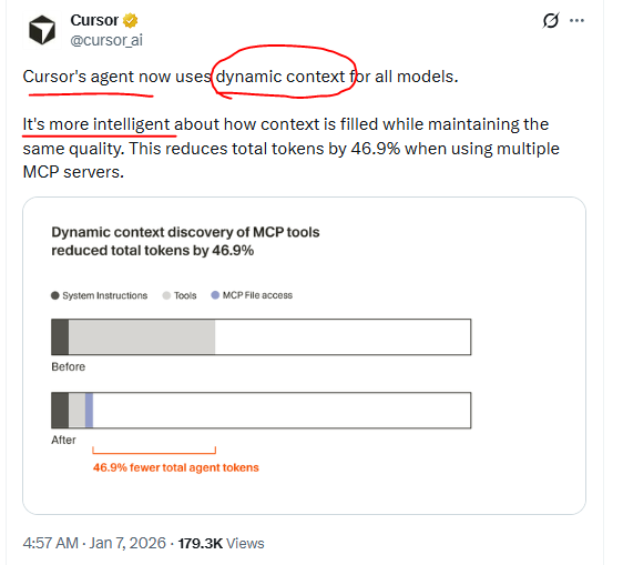 Cursor 的 agent 现在为所有模型使用动态上下文(dynamic context)。它在保持相同质量的同时,更智能地填充上下文。使用多个 MCP 服务器时,这可将总 token 数量减少 46.9%。