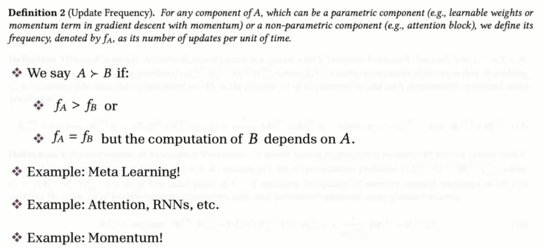 为了正式定义**Nested Learning(嵌套学习)**框架,需要了解两个核心概念:更新频率(Update Frequency)与嵌套系统(Nested System)。