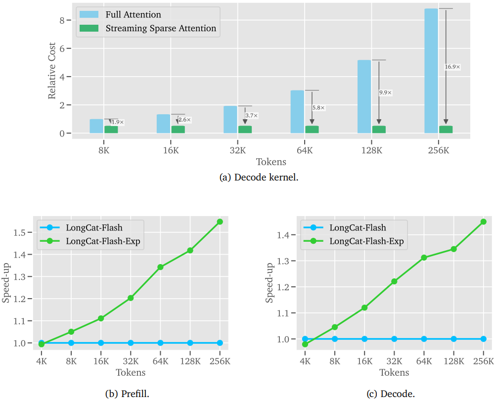 如图 3 所示,在 128K 上下文长度下,流式稀疏注意力核在解码阶段的计算开销相比全注意力核最高可降低 90%。此外,在端到端基准测试中,LongCat-Flash-Exp 在 256K 上下文长度下实现了 超过 50% 的 prefill 阶段加速,并在解码阶段 节省了逾 30% 的计算开销,充分彰显了其在真实推理场景中的高效性与实用性。