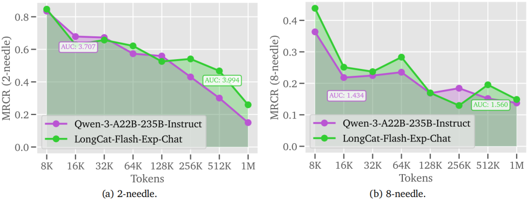此外,对 LongCat-Flash-Exp-Chat 与同样支持 1M 上下文的 Qwen-3 进行了不同上下文长度下的细粒度对比评测。如图2所示,LongCat-Flash-Exp-Chat 在部分上下文长度上明显优于 Qwen-3,并且在整体曲线下面积(AUC)指标上超越 Qwen-3。这一结果表明,LoZA 结合 YaRN 能够高效支撑 1M 级别的上下文扩展,在保持甚至提升性能的同时实现高计算效率。