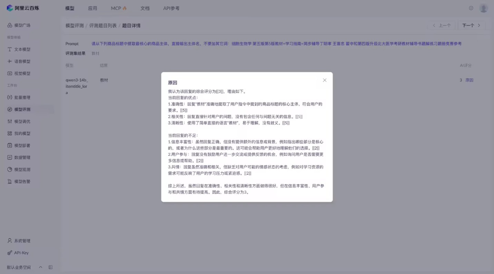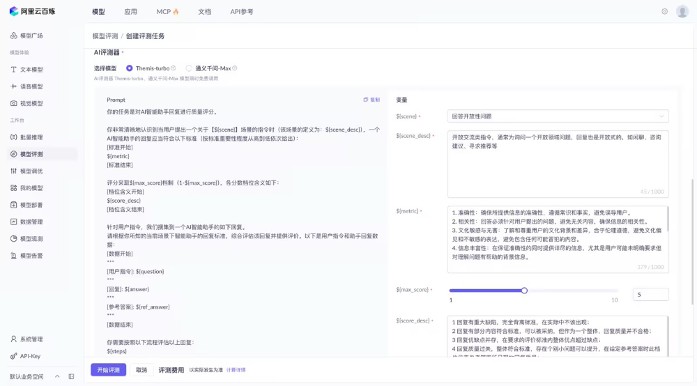 特点:适合评测⽂本⽣成类,可以调整 prompt 来对⾃⼰微调后模型的回答要点进⾏打分,利⽤另⼀个⼤模型的能⼒,实现灵活打分,但是⽐较依赖模型的能⼒以及 prompt,同时分数有时也不够标准化。