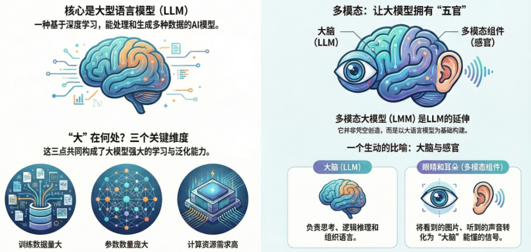 - 多模态组件是眼睛和耳朵:负责把看到的图片、听到的声音转化成“大脑”能听懂的信号。