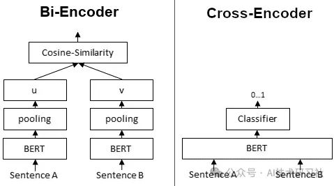 cross-encoder model,直接得到结果; 如果对 BERT 的工作原理比较熟悉(见 BERT paper),就会明白这其实就是 BERT 判别两个句子 (next sentense prediction, NSP)任务的延伸。