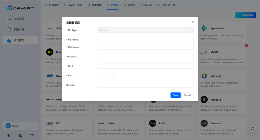 在交互界面中,将数据库添加到数据源中。选择[应用管理]->[数据库]->[添加数据源],依次填写本地数据库信息后保存。