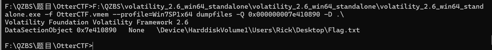 >F:\QZBS\volatility_2.6_win64_standalone\volatility_2.6_win64_standalone\volatility_2.6_win64_standalone.exe -f OtterCTF.vmem --profile=Win7SP1x64 dumpfiles -Q 0x000000007d45dcc0 -D ./