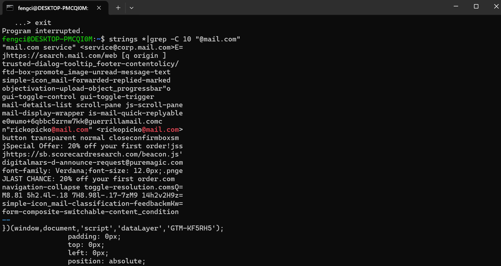 然后我们用 strings 配合 grep 查看这些提取出来的文件,筛选邮箱后缀 @mail.com的前后十行