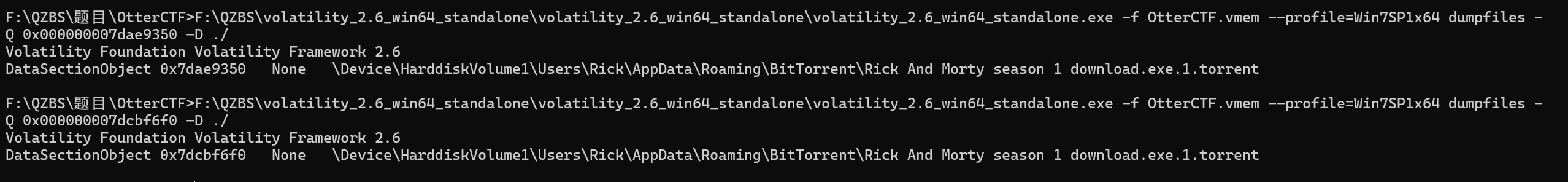 >F:\QZBS\volatility_2.6_win64_standalone\volatility_2.6_win64_standalone\volatility_2.6_win64_standalone.exe -f OtterCTF.vmem --profile=Win7SP1x64 dumpfiles -Q 0x000000007dae9350 -D ./