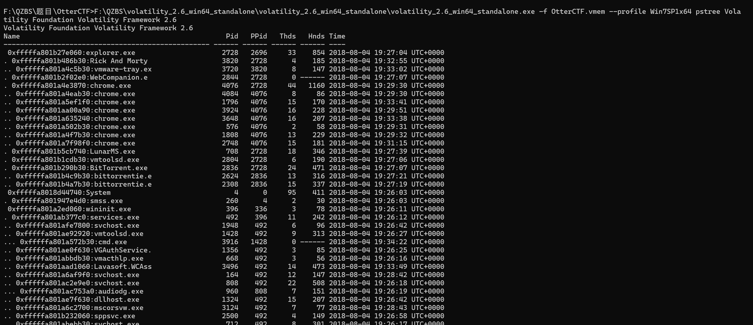 F:\QZBS\volatility_2.6_win64_standalone\volatility_2.6_win64_standalone\volatility_2.6_win64_standalone.exe -f OtterCTF.vmem --profile Win7SP1x64 pstree Volatility Foundation Volatility Framework 2.6