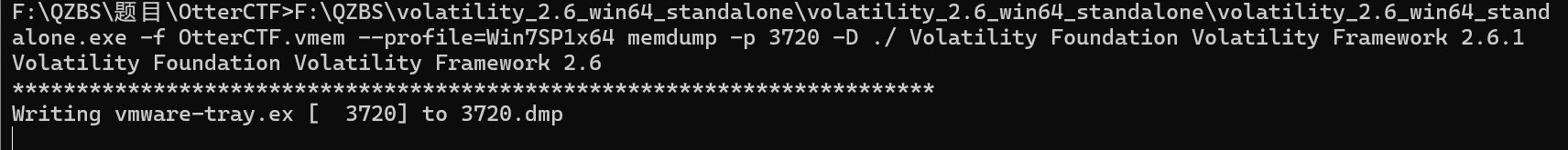 F:\QZBS\volatility_2.6_win64_standalone\volatility_2.6_win64_standalone\volatility_2.6_win64_standalone.exe -f OtterCTF.vmem --profile=Win7SP1x64 memdump -p 3720 -D ./ Volatility Foundation Volatility Framework 2.6.1