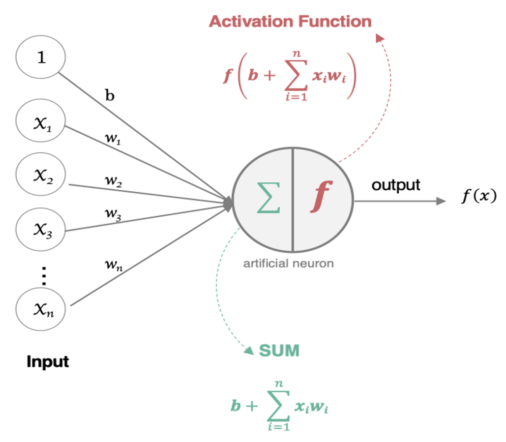这一过程类似于将来自不同树突(每个树突具有不同权重)的信息进行加权计算,输入到细胞中进行总和运算,最后通过激活函数输出细胞值。
