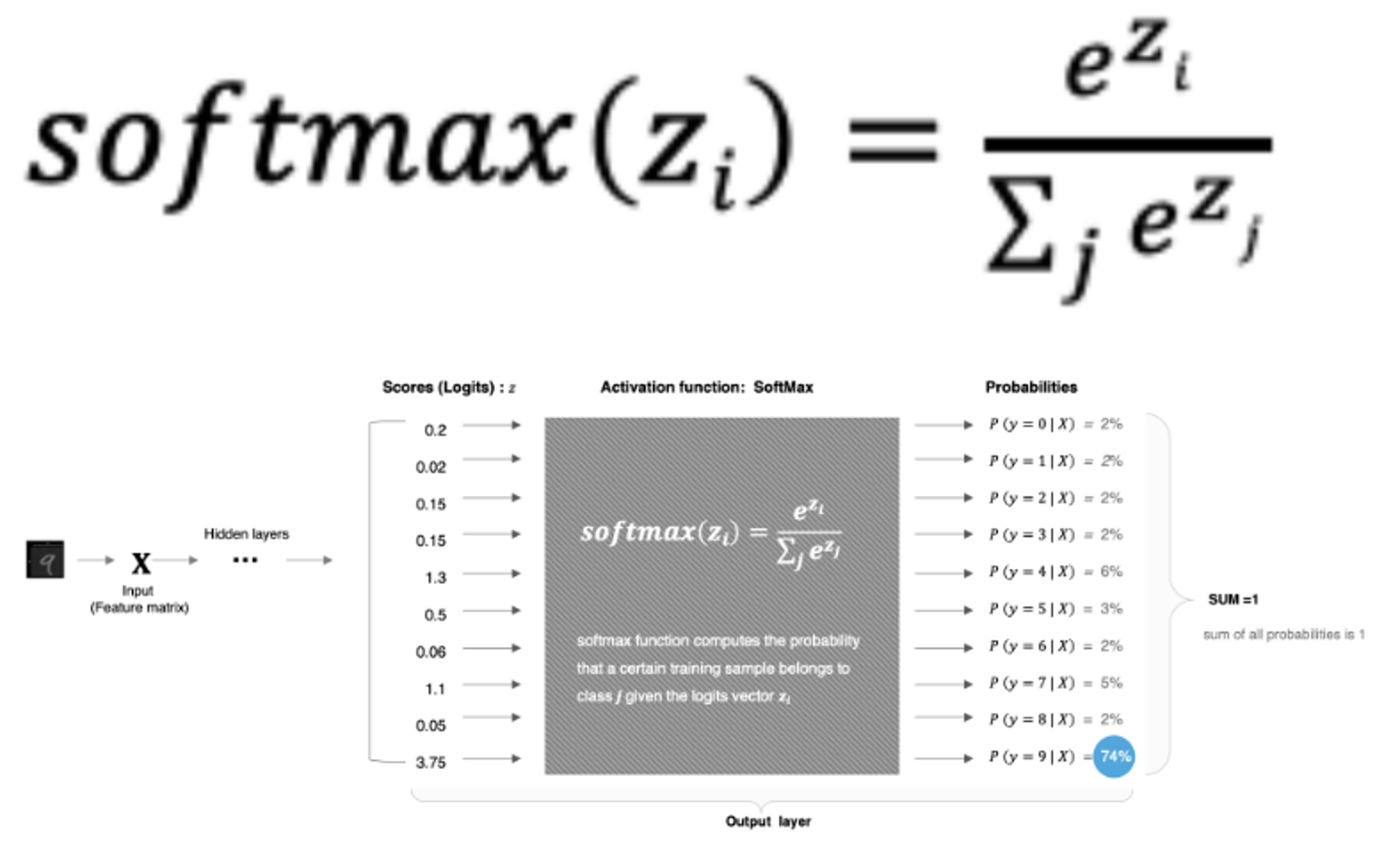 softmax用于多分类过程中,它是二分类函数sigmoid在多分类上的推广,目的是将多分类的结果以概率的形式展现出来。计算方法如下图所示: