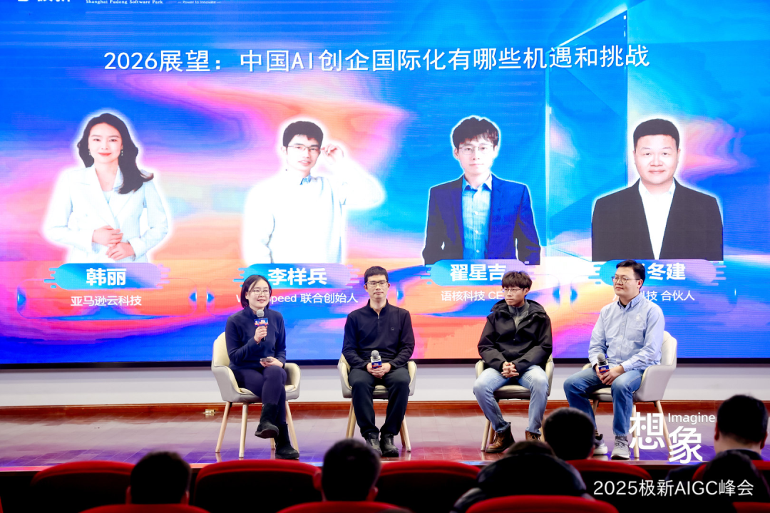 2025年12月26日,【想象·2025极新AIGC峰会】在上海浦东浦软大厦成功召开。亚马逊云科技创业与投资生态合作战略顾问韩丽 、Wavespeed联合创始人李样兵、语核科技创始人兼CEO翟星吉、八友科技合伙人肖冬建在会上进行了题为《2026展望:中国AI创企国际化有哪些机遇和挑战》的圆桌讨论。重点讨论了进入AI时代创业企业如何切入海外市场、出海有哪些机遇与挑战等议题,给大家带来新观点、新思考、新期待。