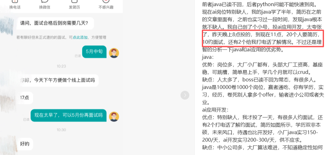 最近逛求职论坛时,刷到一个很有参考价值的帖子:一位求职者分享了自己的求职逆袭经历——原本瞄准Java后端开发岗,却在求职过程中敏锐察觉到市场风向变化,果断调整策略转投AI应用开发岗,结果收获了远超预期的回应。
