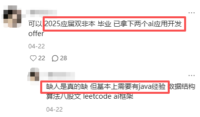 这个帖子的评论区也印证了这一趋势,不少求职者分享了自己的真实经历:有双非应届本科生表示,自己已经成功拿到2个AI应用开发岗的offer,直言这个岗位“是真的缺人”,并且特别提到“有Java经验的求职者会更有优势”,这也解释了为什么那位从Java转岗的求职者能快速拿到回应。