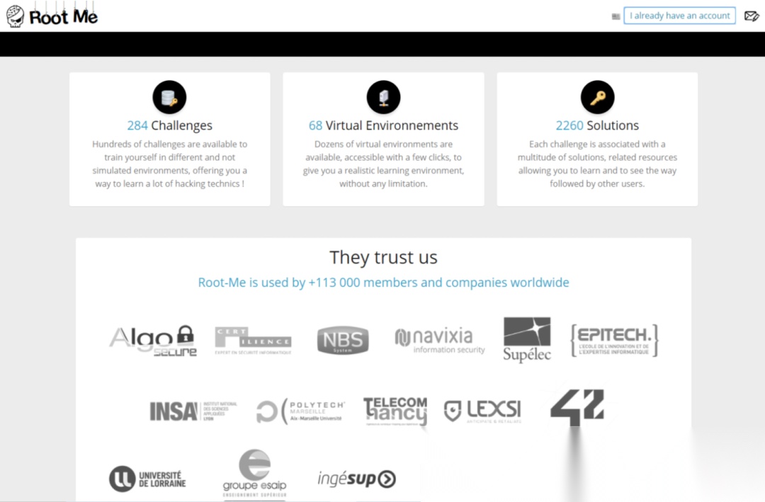 - Root Me:免费内容多,500+挑战项目,够新手练手。