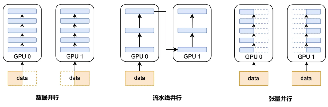 放一张数据并行、流水线并行、张量并行的简单对比: