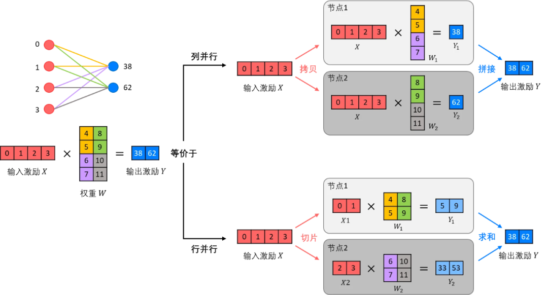 张量切分方式分为按行进行切分和按列进行切分,分别对应行并行(Row Parallelism)(权重矩阵按行分割)与列并行(Column Parallelism)(权重矩阵按列分割)。