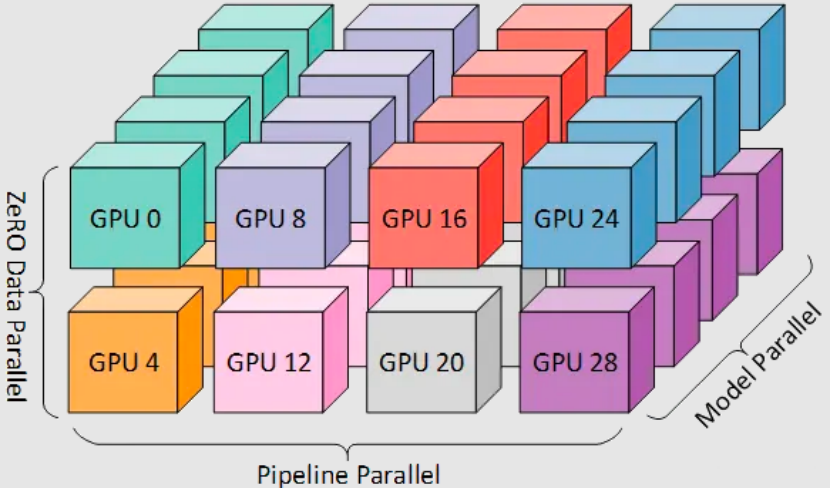 更高级的,是3D并行,通过“数据并行+张量并行+流水线并行”,实现三重拆分,是超大模型训练的主流方案。