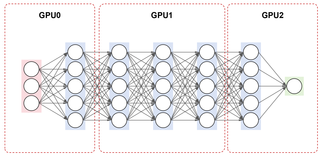 例如,对于一个包含7层的神经网络,将12层放在第一个GPU上,35层放在第二个GPU上,6~7层放在第三个GPU上。训练时,数据按照顺序,在不同的GPU上进行处理。