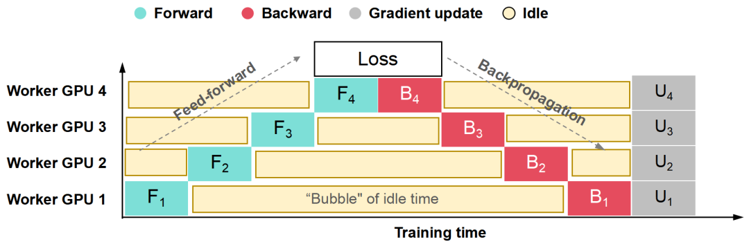 乍一看,流水并行有点像串行。每个GPU需要等待前一个GPU的计算结果,可能会导致大量的GPU资源浪费。