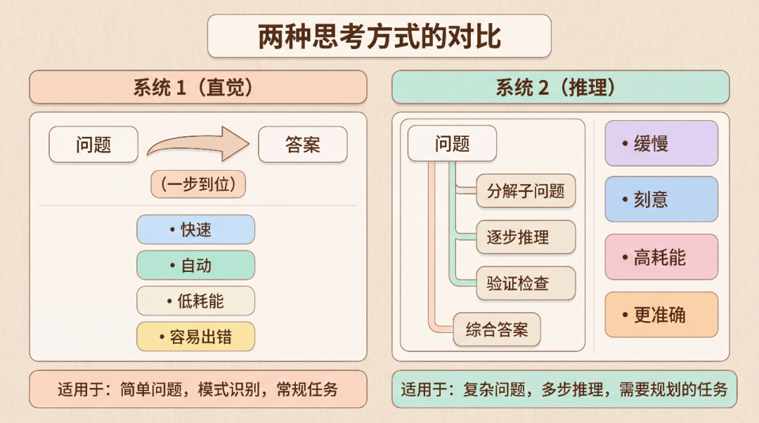 原始的 LLM 更像系统 1——它通过模式匹配和概率预测,在毫秒级别内生成回答。这种"直觉式"响应对于简单问题足够了,但面对复杂问题时,往往力不从心。