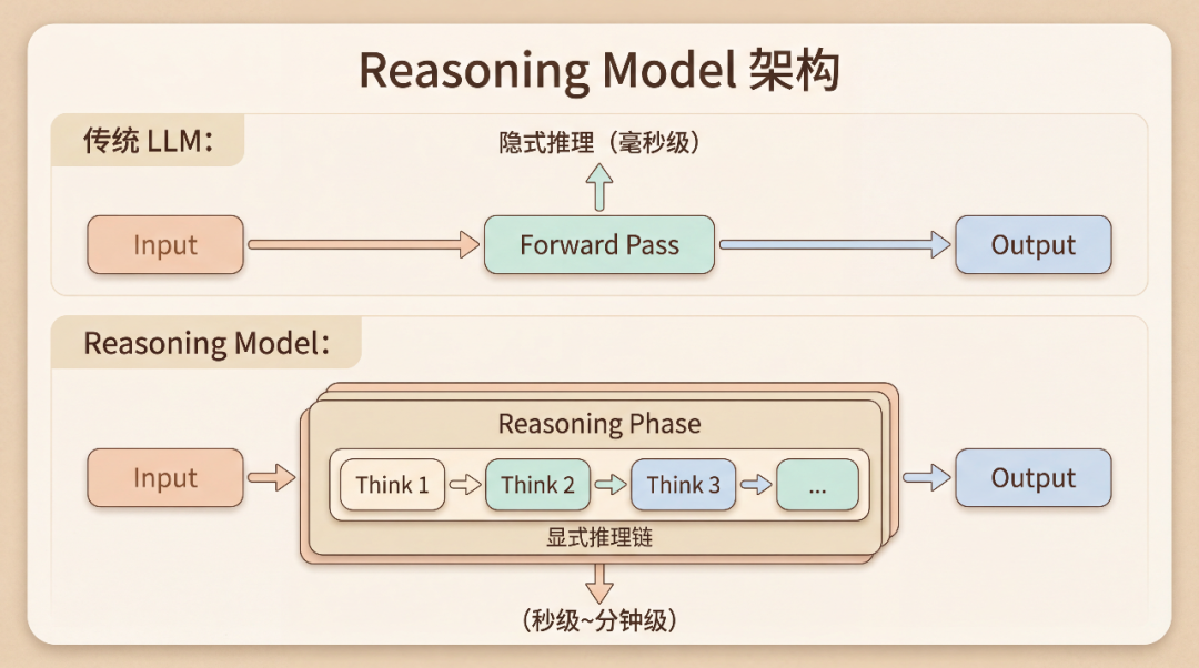 传统 LLM 的推理是"隐式"的——思考过程隐藏在神经网络的前向传播中。Reasoning Model 则引入了"显式"的推理阶段: