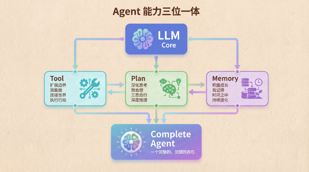 Tool、Plan、Memory——这三大能力从不同维度武装了 LLM: