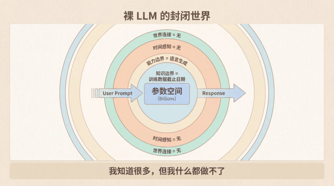 这样的 LLM,即使再强大,也只能完成封闭式任务——那些答案完全包含在问题和训练知识中的任务。一旦任务需要实时信息、需要执行操作、需要长期记忆,它就束手无策。