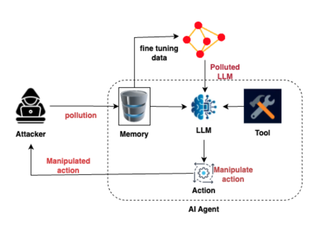 (1)攻击起点:攻击者(Attacker)通过 “污染(pollution)” 操作,篡改 AI 智能体的 “记忆模块(Memory)”。