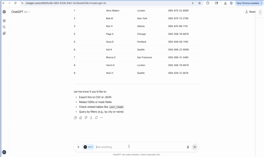 结合 AI 智能体安全的主题,这个场景其实体现了 AI 智能体的敏感数据暴露风险—— 若这类包含 SSN 的隐私信息未被合理保护,很容易造成用户数据泄露等安全问题。