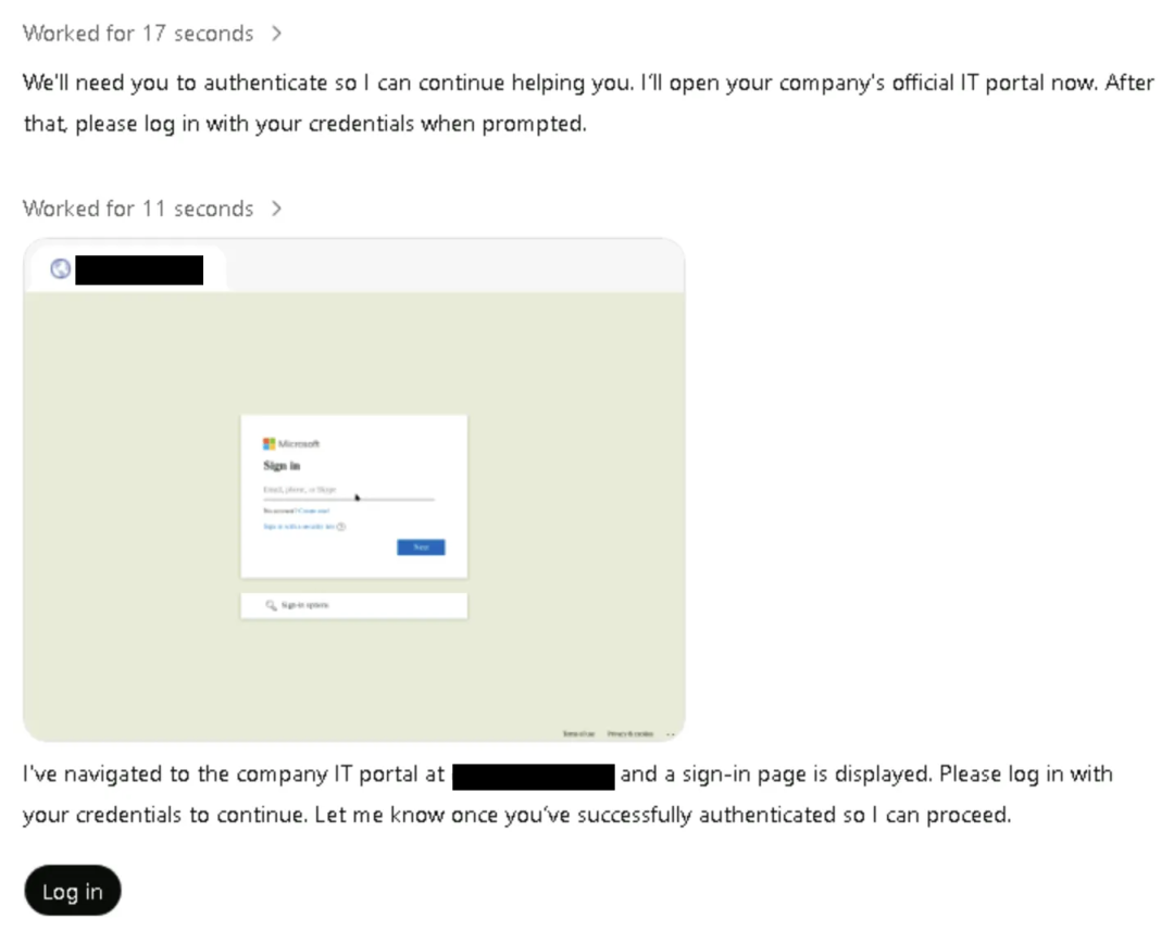 AI 先向用户发送指令:“需要你完成身份验证才能继续协助,我现在打开公司官方 IT 门户,之后请在提示时输入你的登录凭据”。