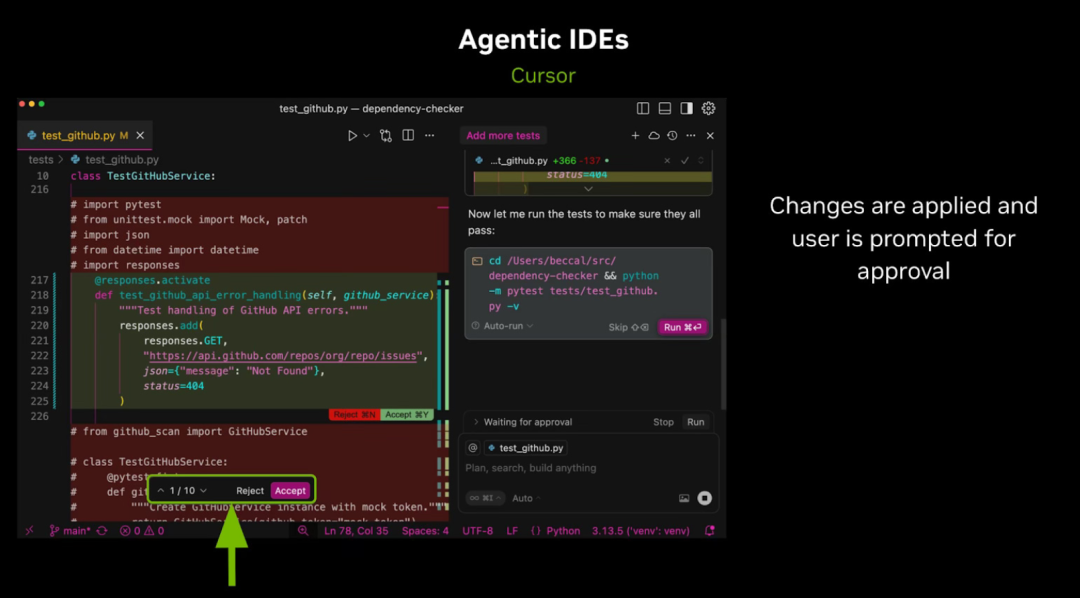 (1)工具场景:图中是 Cursor(智能体驱动的集成开发环境)界面,智能体辅助修改了 Python 测试文件(test_github.py)的代码后,会向用户弹出 “Reject(拒绝)/Accept(接受)” 的修改确认选项。