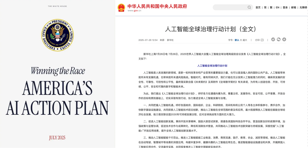 7 月,中美两国几乎同时发布 AI 行动计划,不约而同地将 AI 治理视为一项长期性、系统性、跨国界的工程。