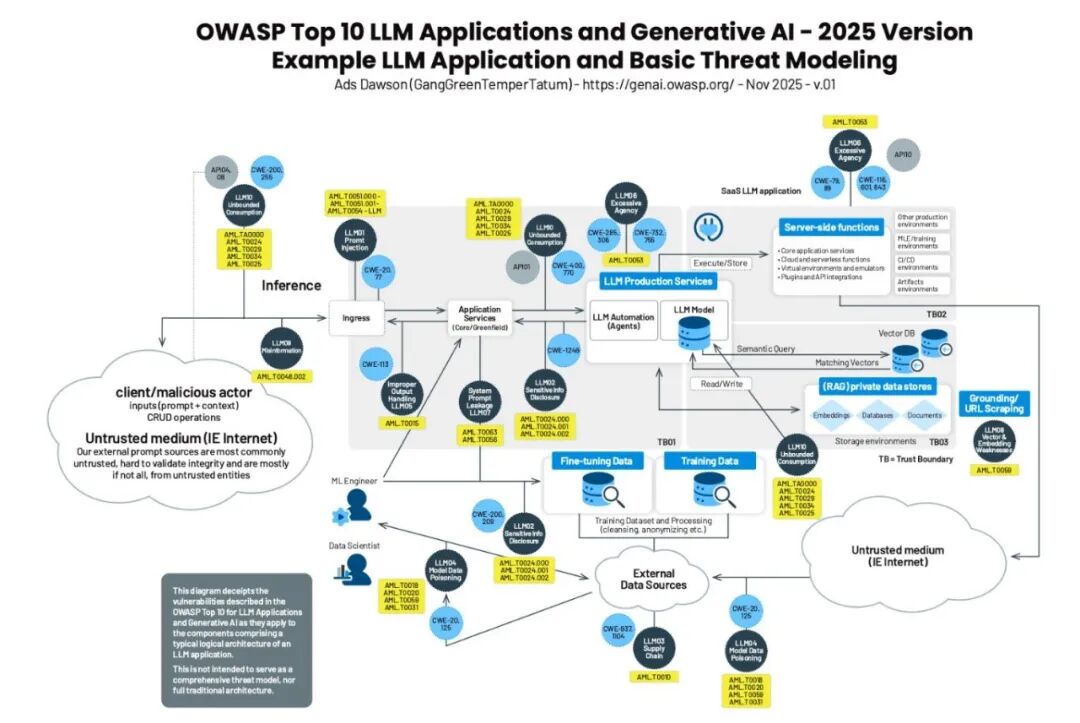 国际非营利组织OWASP持续更新2025 年大模型十大安全风险,将提示词注入、敏感信息泄露、供应链安全、数据与模型投毒等风险明确列出,给出了当前大模型应用中最容易被忽视、但代价极高的风险清单。
