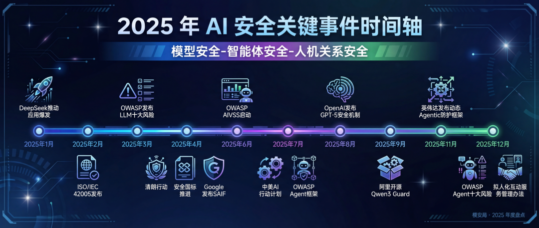 【模安局导读】回顾这一年,AI 安全的关注重心从年初的大模型安全,演进至年中的智能体安全,并在年底指向隐约浮现的人机关系安全,整体脉络愈发清晰。其间,内容、数据、网络与 AI 安全深度交织,政策、标准、框架、技术与产品协同推进;传统安全厂商与大模型公司正面交锋,科技巨头与创业团队纷纷入场。竞争与合作并存,风险与机遇共生,共同勾勒出这一年 AI 安全演进的时代图景。