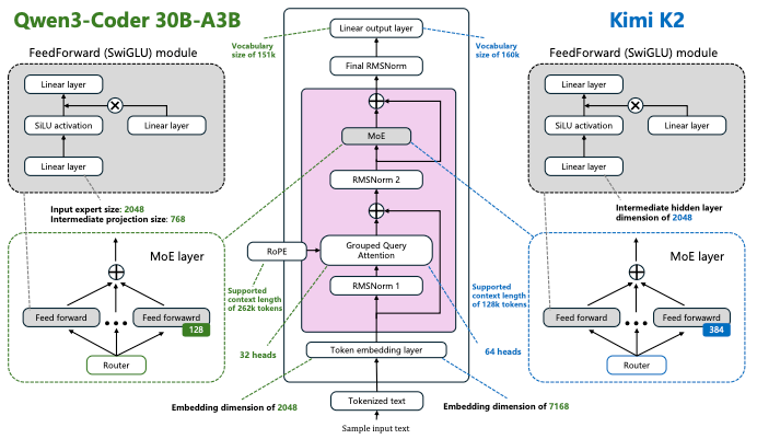 要理解当前模型为何能同时做到“大”且“快”,我们需要深入架构内核。论文在中通过对比Qwen3-Coder和Kimi-K2,直观展示了两种主流架构的差异: