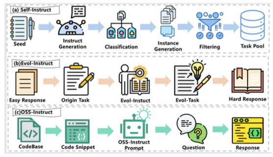 - OSS-Instruct:为了解决生成数据的多样性问题,研究者利用开源代码片段(OSS)反推问题,确保训练数据贴近真实开发场景,而非仅仅是LeetCode题库。