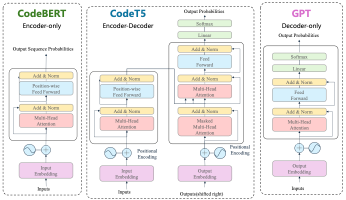 - 特点:这一时期的模型多采用Encoder-only架构。它们写代码的能力较弱,但非常擅长“读”代码,主要用于代码搜索和漏洞检测。