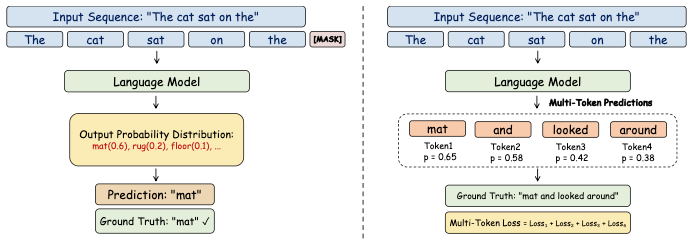 NTP (Next Token Prediction):这是基础。给定 “The cat”,预测 “sat”。模型只能看眼前的一步,学会的是基础语法。