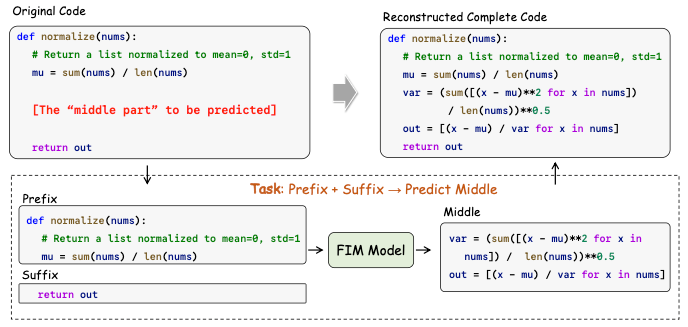 FIM (Fill-in-the-Middle):这是IDE补全的灵魂。训练时,模型被喂入代码的前缀 (Prefix) 和 后缀 (Suffix),要求它填补中间的Middle部分。没有FIM训练的模型,无法胜任IDE中的光标处补全任务,因为它不知道后面已经写了什么。