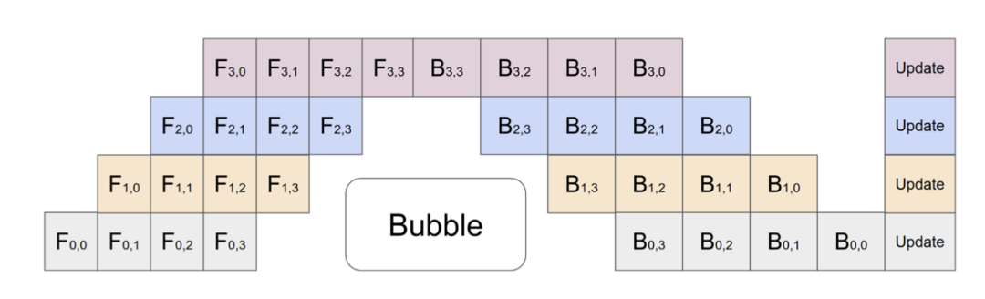 如图39中Gpipe流程所示,因为要在本batch结束后同步梯度信息以保证全局的Gradient统一的,虽然1个batch中F0和B0被拆成了4个微批(F0,0、F0,1、F0,2、F0,3)和(B0,3、 B0,2、 B0,1、 B0,0),但是每个Device至少有6个time stage在等待,占总时间14 stage的42%,较纯Model parallelism有所改善,但是利用效率仍然不算高。