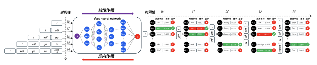 图5:前馈计算预测下一个单词并打分、反向传播调整权重参数