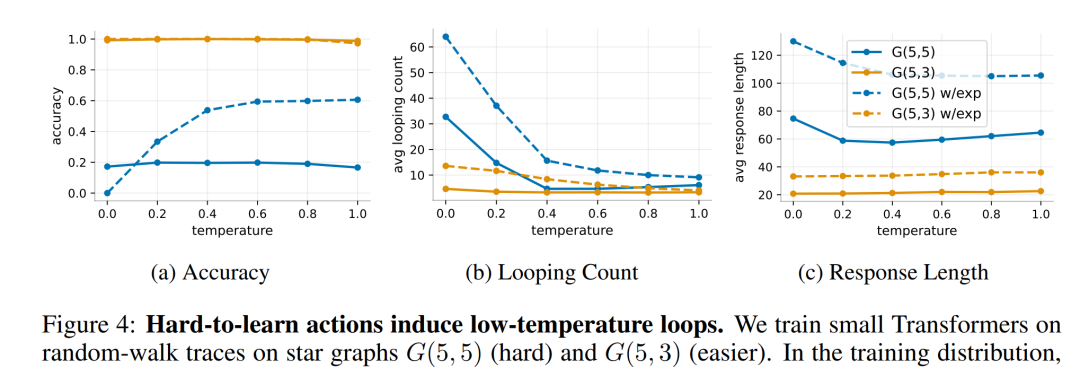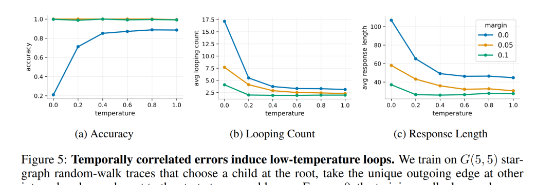 b) Transformer 对错误有自相关性 → 时序复读循环 - 升温=止痛药,** exploration 不能替代学习**