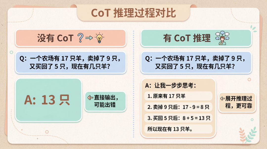 CoT 的魔力在于:它强制 LLM "展开"思考过程,而不是直接跳到答案。这种"慢下来"的效果,让 LLM 能够处理更复杂的问题。